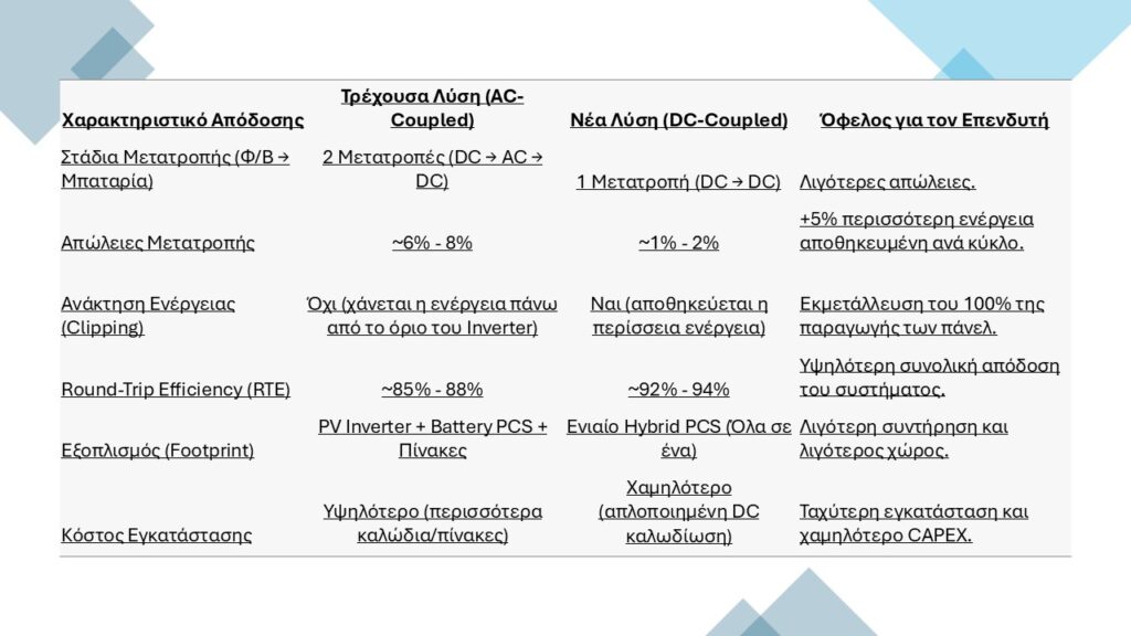 - Απευθείας σύνδεση με Φωτοβολταϊκά Η νέα σχεδίαση επιτρέπει στο σύστημα αποθήκευσης να συνδέεται απευθείας στην DC πλευρά των φωτοβολταϊκών, ελαχιστοποιώντας τις απώλειες μετατροπής.