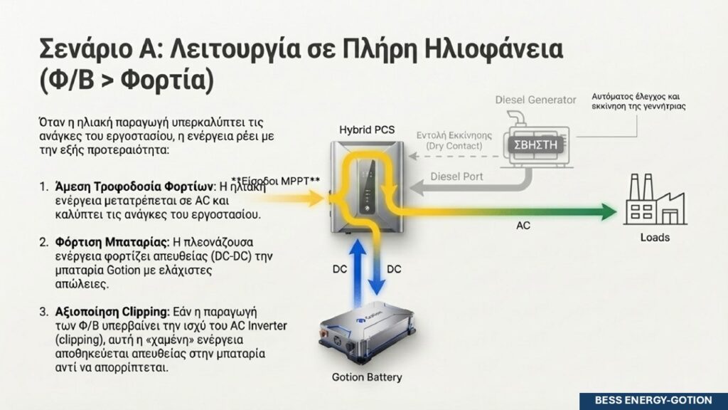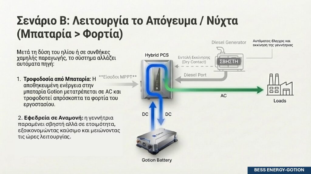 - Υποστήριξη γεννητριών Το σύστημα υποστηρίζει τη σύνδεση με θύρα πετρελαιογεννήτριας (diesel port) για μέγιστη ενεργειακή ασφάλεια σε περιπτώσεις ανάγκης.