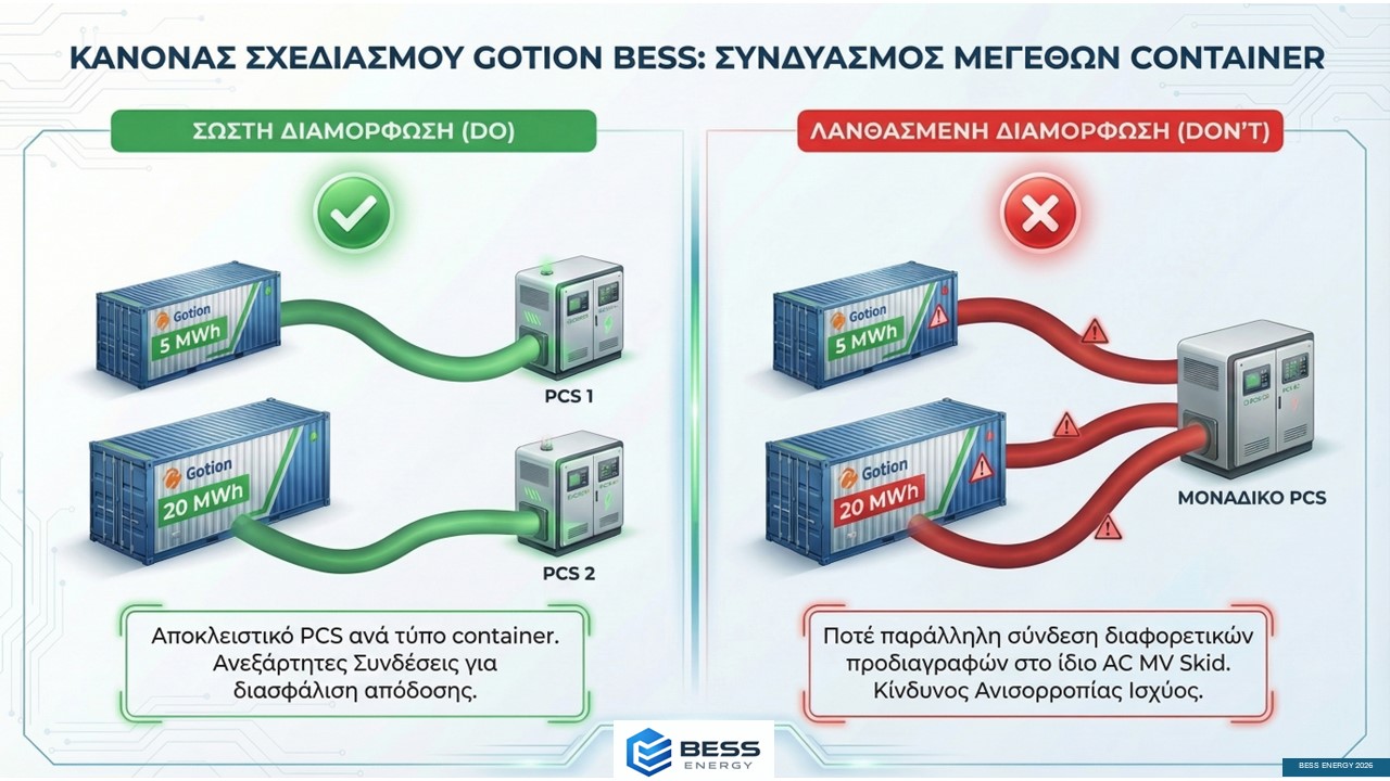 Κάθε διαφορετικό μέγεθος battery container πρέπει να συνδέεται σε δικό του, ανεξάρτητο MV Skid (μονάδα PCS).